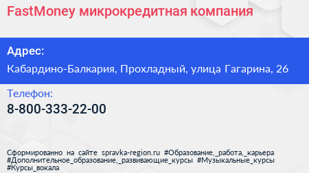 FastMoney, микрокредитная компания по адресу Кабардино-Балкария, Прохладный, улица Гагарина, 26 в дальнейшем Организация, размещена в следующих категориях: