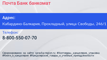 Почта Банк, банкомат по адресу Кабардино-Балкария, Прохладный, улица Свободы, 246/1 в дальнейшем Организация, размещена в следующих категориях: