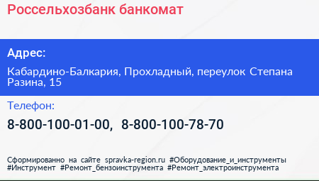 Россельхозбанк, банкомат по адресу Кабардино-Балкария, Прохладный, переулок Степана Разина, 15 в дальнейшем Организация, размещена в следующих категориях:
