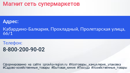 Магнит, сеть супермаркетов по адресу Кабардино-Балкария, Прохладный, Пролетарская улица, 66/1 в дальнейшем Организация, размещена в следующих категориях: