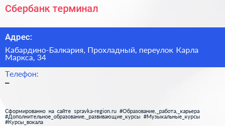 Сбербанк, терминал по адресу Кабардино-Балкария, Прохладный, переулок Карла Маркса, 34 в дальнейшем Организация, размещена в следующих категориях: