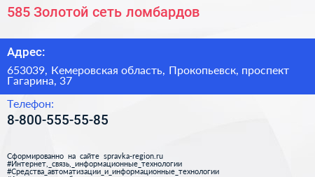 585*Золотой, сеть ломбардов по адресу 653039, Кемеровская область, Прокопьевск, проспект Гагарина, 37 в дальнейшем Организация, размещена в следующих категориях: