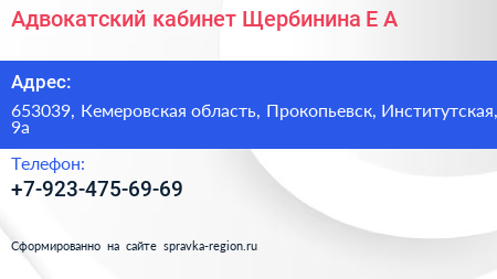 Адвокатский кабинет Щербинина Е.А. по адресу 653039, Кемеровская область, Прокопьевск, Институтская, 9а в дальнейшем Организация, размещена в следующих категориях: