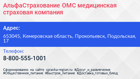 АльфаСтрахование-ОМС, медицинская страховая компания по адресу 653045, Кемеровская область, Прокопьевск, Подольская, 17 в дальнейшем Организация, размещена в следующих категориях: