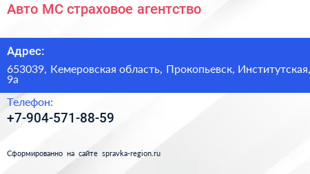 Авто МС, страховое агентство по адресу 653039, Кемеровская область, Прокопьевск, Институтская, 9а в дальнейшем Организация, размещена в следующих категориях: