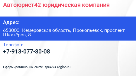 Автоюрист42, юридическая компания по адресу 653000, Кемеровская область, Прокопьевск, проспект Шахтёров, 8 в дальнейшем Организация, размещена в следующих категориях: