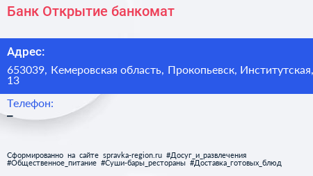 Банк Открытие, банкомат по адресу 653039, Кемеровская область, Прокопьевск, Институтская, 13 в дальнейшем Организация, размещена в следующих категориях: