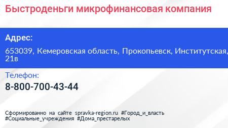 Быстроденьги, микрофинансовая компания по адресу 653039, Кемеровская область, Прокопьевск, Институтская, 21в в дальнейшем Организация, размещена в следующих категориях: