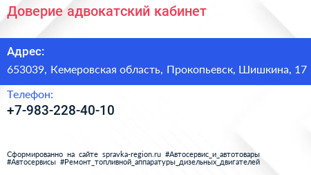 Доверие, адвокатский кабинет по адресу 653039, Кемеровская область, Прокопьевск, Шишкина, 17 в дальнейшем Организация, размещена в следующих категориях: