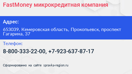 FastMoney, микрокредитная компания по адресу 653039, Кемеровская область, Прокопьевск, проспект Гагарина, 37 в дальнейшем Организация, размещена в следующих категориях: