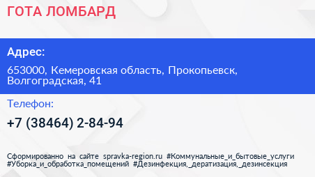 ГОТА ЛОМБАРД по адресу 653000, Кемеровская область, Прокопьевск, Волгоградская, 41 в дальнейшем Организация, размещена в следующих категориях: