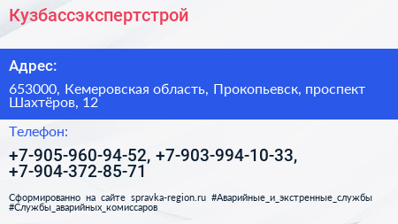 Кузбассэкспертстрой по адресу 653000, Кемеровская область, Прокопьевск, проспект Шахтёров, 12 в дальнейшем Организация, размещена в следующих категориях: