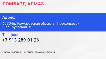 ЛОМБАРД АЛМАЗ+ по адресу 653046, Кемеровская область, Прокопьевск, Оренбургская, 8 в дальнейшем Организация, размещена в следующих категориях: