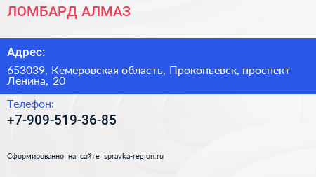 ЛОМБАРД АЛМАЗ+ по адресу 653039, Кемеровская область, Прокопьевск, проспект Ленина, 20 в дальнейшем Организация, размещена в следующих категориях: