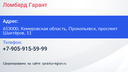 Ломбард Гарант по адресу 653000, Кемеровская область, Прокопьевск, проспект Шахтёров, 11 в дальнейшем Организация, размещена в следующих категориях: