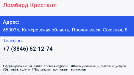 Ломбард Кристалл+ по адресу 653036, Кемеровская область, Прокопьевск, Союзная, 8 в дальнейшем Организация, размещена в следующих категориях: