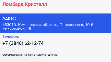 Ломбард Кристалл+ по адресу 653010, Кемеровская область, Прокопьевск, 10-й микрорайон, 48 в дальнейшем Организация, размещена в следующих категориях: