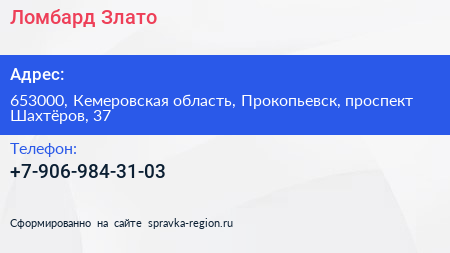 Ломбард Злато по адресу 653000, Кемеровская область, Прокопьевск, проспект Шахтёров, 37 в дальнейшем Организация, размещена в следующих категориях: