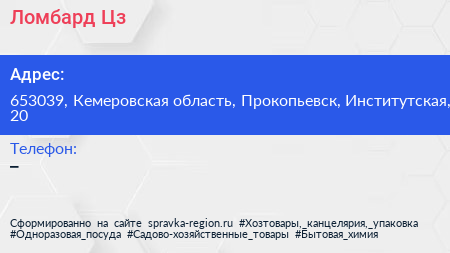 Ломбард Цз по адресу 653039, Кемеровская область, Прокопьевск, Институтская, 20 в дальнейшем Организация, размещена в следующих категориях: