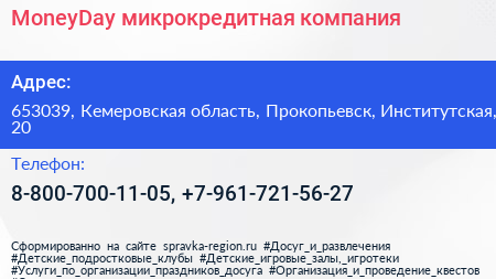 MoneyDay, микрокредитная компания по адресу 653039, Кемеровская область, Прокопьевск, Институтская, 20 в дальнейшем Организация, размещена в следующих категориях: