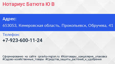 Нотариус Батюта Ю.В. по адресу 653053, Кемеровская область, Прокопьевск, Обручева, 41 в дальнейшем Организация, размещена в следующих категориях: