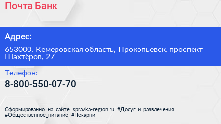 Почта Банк по адресу 653000, Кемеровская область, Прокопьевск, проспект Шахтёров, 27 в дальнейшем Организация, размещена в следующих категориях: