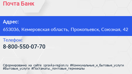Почта Банк по адресу 653036, Кемеровская область, Прокопьевск, Союзная, 42 в дальнейшем Организация, размещена в следующих категориях: