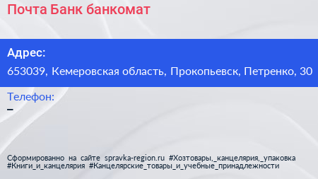 Почта Банк, банкомат по адресу 653039, Кемеровская область, Прокопьевск, Петренко, 30 в дальнейшем Организация, размещена в следующих категориях: