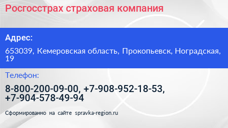 Росгосстрах, страховая компания по адресу 653039, Кемеровская область, Прокопьевск, Ноградская, 19 в дальнейшем Организация, размещена в следующих категориях: