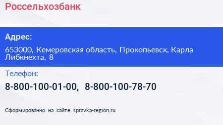 Россельхозбанк по адресу 653000, Кемеровская область, Прокопьевск, Карла Либкнехта, 8 в дальнейшем Организация, размещена в следующих категориях: