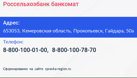 Россельхозбанк, банкомат по адресу 653053, Кемеровская область, Прокопьевск, Гайдара, 50а в дальнейшем Организация, размещена в следующих категориях: