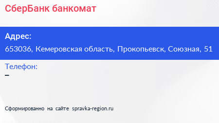 СберБанк, банкомат по адресу 653036, Кемеровская область, Прокопьевск, Союзная, 51 в дальнейшем Организация, размещена в следующих категориях: