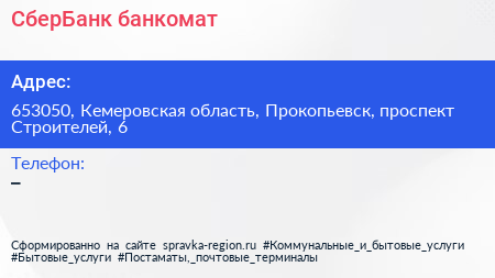 СберБанк, банкомат по адресу 653050, Кемеровская область, Прокопьевск, проспект Строителей, 6 в дальнейшем Организация, размещена в следующих категориях: