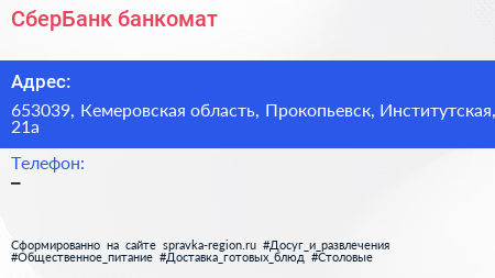 СберБанк, банкомат по адресу 653039, Кемеровская область, Прокопьевск, Институтская, 21а в дальнейшем Организация, размещена в следующих категориях: