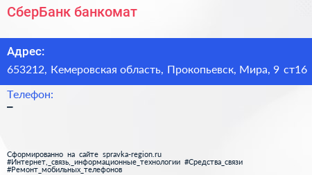 СберБанк, банкомат по адресу 653212, Кемеровская область, Прокопьевск, Мира, 9 ст16 в дальнейшем Организация, размещена в следующих категориях: