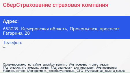 СберСтрахование, страховая компания по адресу 653039, Кемеровская область, Прокопьевск, проспект Гагарина, 28 в дальнейшем Организация, размещена в следующих категориях: