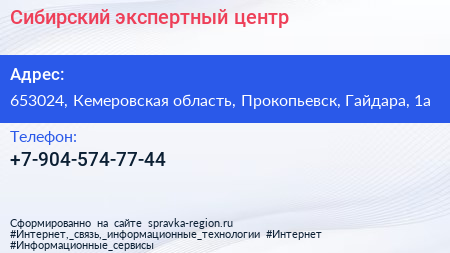 Сибирский экспертный центр по адресу 653024, Кемеровская область, Прокопьевск, Гайдара, 1а в дальнейшем Организация, размещена в следующих категориях: