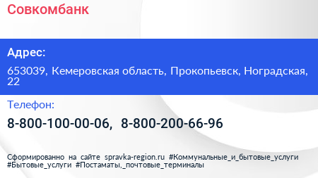 Совкомбанк по адресу 653039, Кемеровская область, Прокопьевск, Ноградская, 22 в дальнейшем Организация, размещена в следующих категориях: