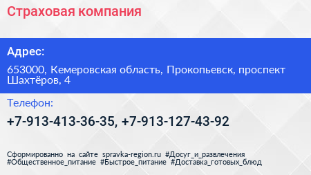 Страховая компания по адресу 653000, Кемеровская область, Прокопьевск, проспект Шахтёров, 4 в дальнейшем Организация, размещена в следующих категориях: