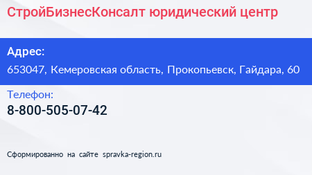 СтройБизнесКонсалт, юридический центр по адресу 653047, Кемеровская область, Прокопьевск, Гайдара, 60 в дальнейшем Организация, размещена в следующих категориях: