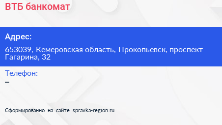 ВТБ, банкомат по адресу 653039, Кемеровская область, Прокопьевск, проспект Гагарина, 32 в дальнейшем Организация, размещена в следующих категориях: