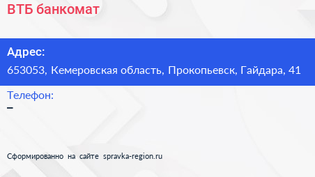 ВТБ, банкомат по адресу 653053, Кемеровская область, Прокопьевск, Гайдара, 41 в дальнейшем Организация, размещена в следующих категориях: