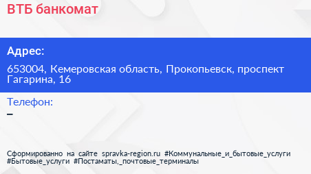 ВТБ, банкомат по адресу 653004, Кемеровская область, Прокопьевск, проспект Гагарина, 16 в дальнейшем Организация, размещена в следующих категориях: