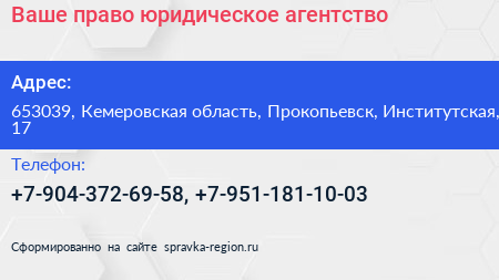 Ваше право, юридическое агентство по адресу 653039, Кемеровская область, Прокопьевск, Институтская, 17 в дальнейшем Организация, размещена в следующих категориях: