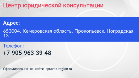Центр юридической консультации по адресу 653004, Кемеровская область, Прокопьевск, Ноградская, 13 в дальнейшем Организация, размещена в следующих категориях: