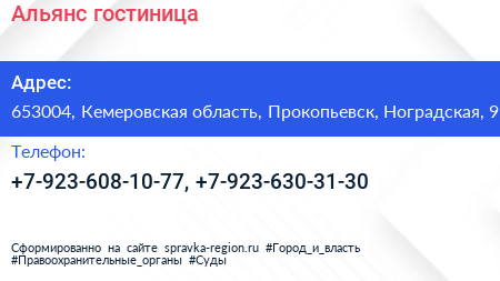 Альянс, гостиница по адресу 653004, Кемеровская область, Прокопьевск, Ноградская, 9 в дальнейшем Организация, размещена в следующих категориях:
