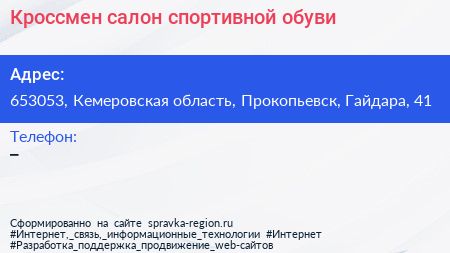 Кроссмен, салон спортивной обуви по адресу 653053, Кемеровская область, Прокопьевск, Гайдара, 41 в дальнейшем Организация, размещена в следующих категориях: