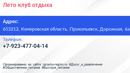 Лето, клуб отдыха по адресу 653212, Кемеровская область, Прокопьевск, Дорожная, 6а в дальнейшем Организация, размещена в следующих категориях: