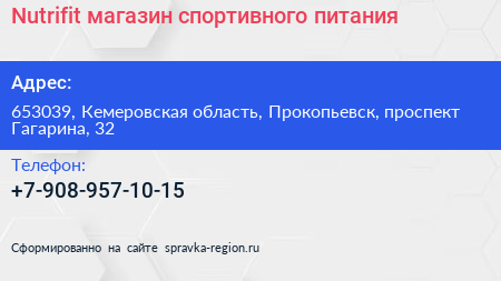 Nutrifit, магазин спортивного питания по адресу 653039, Кемеровская область, Прокопьевск, проспект Гагарина, 32 в дальнейшем Организация, размещена в следующих категориях:
