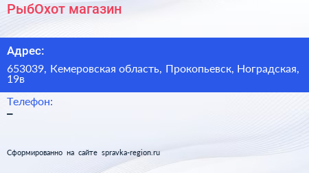 РыбОхот, магазин по адресу 653039, Кемеровская область, Прокопьевск, Ноградская, 19в в дальнейшем Организация, размещена в следующих категориях: